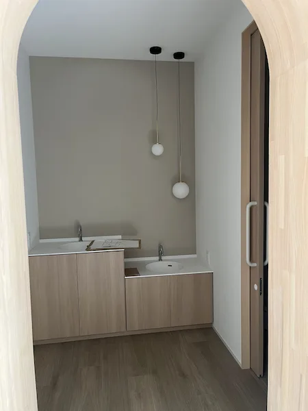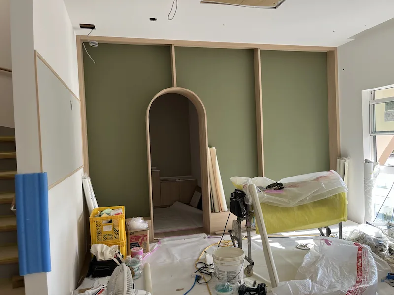 第2待合のアーチの壁の奥はお手洗いになっています。ここにも患者さんに居心地よく過ごしてもらう工夫をしてありますので完成をお楽しみに。