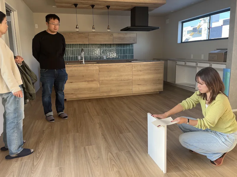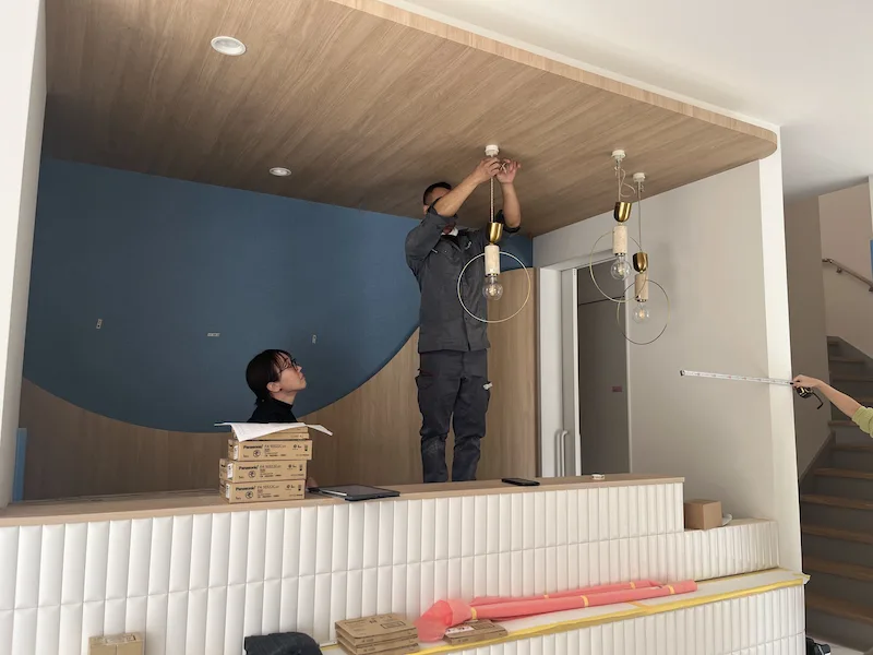 ↑受付の照明の高さを調整してもらっています。(左)コミュニティルームにおく机の色を検討している様子です(右)