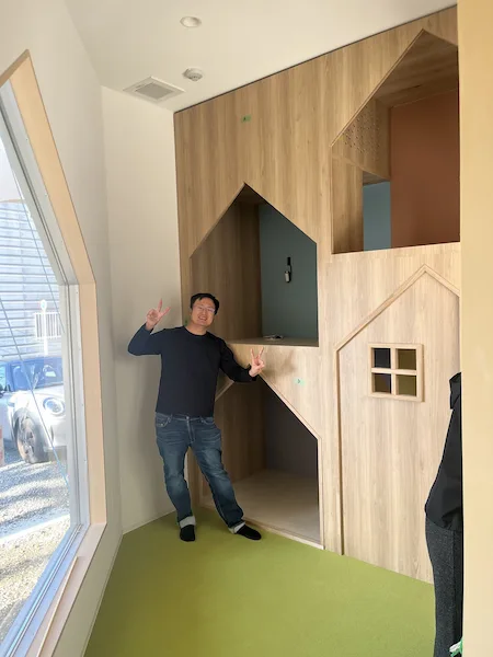 キッズルームはお家の形の窓にお家の形のアスレチックを作ってお家だらけのかわいい空間です。お子さんが体を動かして遊べるようになってます。