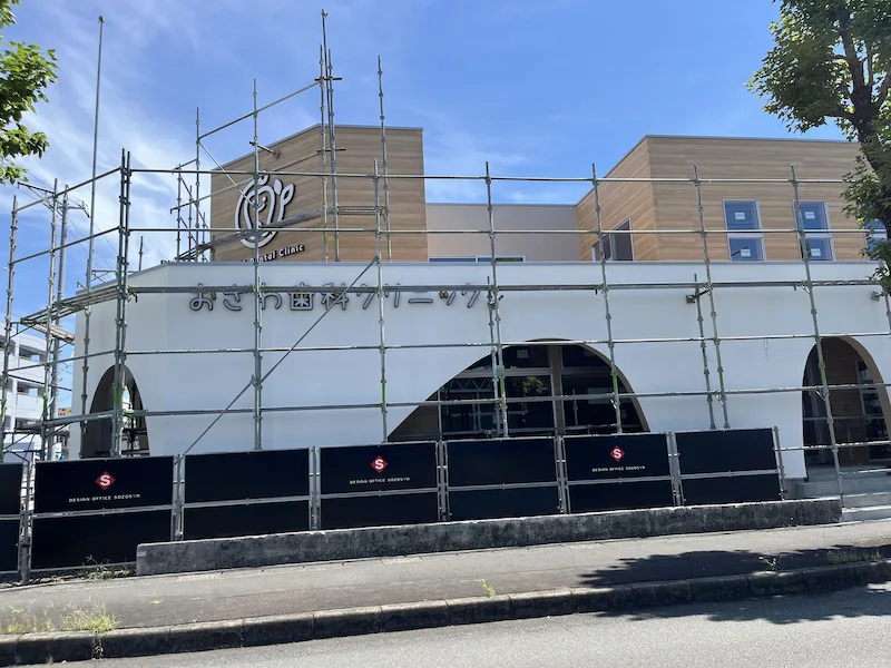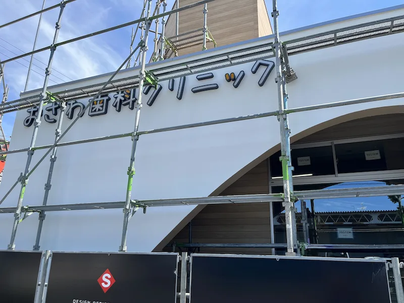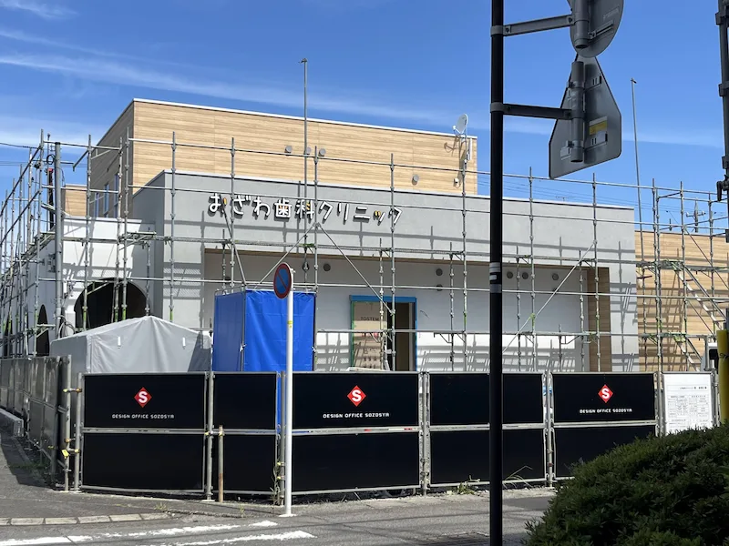 8月の新クリニック建築の様子です。西側の外壁に医院名「おざわ歯科クリニック」がつきました!