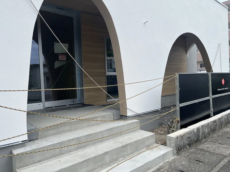 正面玄関の両サイドにはスロープがついているので、ベビーカーや車いす、足腰の不自由なかたにも使ていただきやすいバリアフリー設計になってます。8月は正面玄関の階段に貼るタイルをどんな色にしようか悩んでいました。