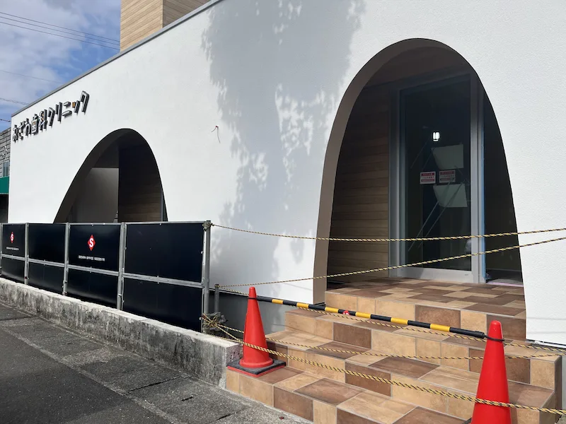 外観は足場がなくなって建物の様子がすっきり見えるようになりました!患者さんから「珍しい形の建物だね。」と言われることが時々あるのですが、この形は、建物自体が看板になるような少し変わった形でなおかつ優しい雰囲気にして欲しいと設計士さんにお願いしてこういう形に作っていただきました。