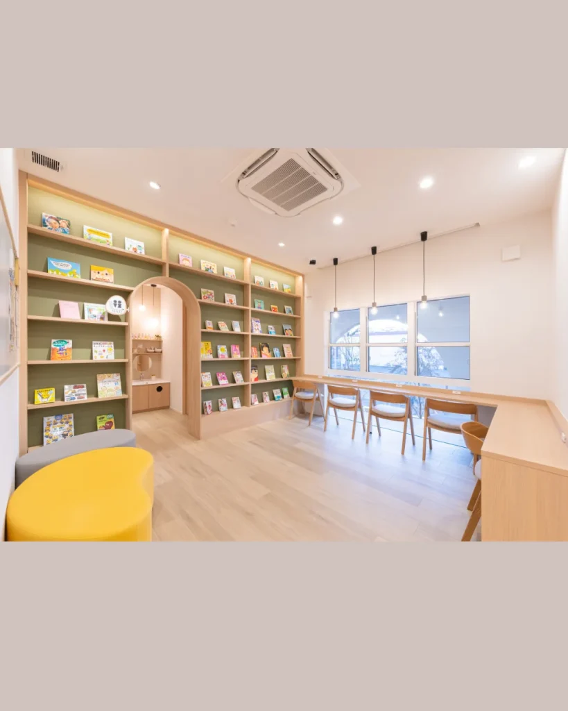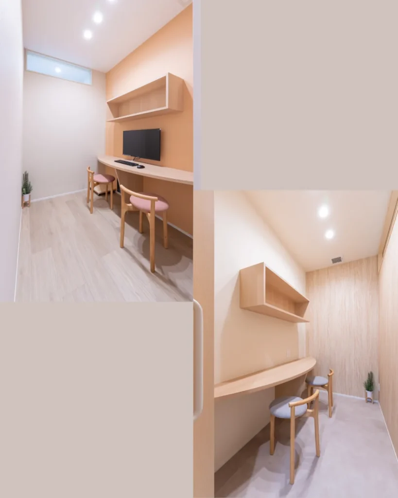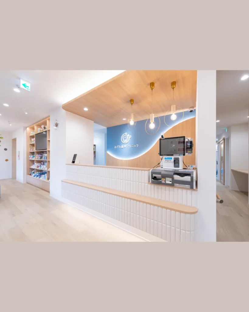 待合のデザインも待ち時間になるべく快適に過ごせるよう工夫しました。アスレチック付きキッズルーム、お口の筋トレ用アクティビティルーム、キッチン付きのスタッフルーム兼食育イベントルーム、スタッフ用お昼寝部屋、など全クリニックにはなかった部屋をいろいろと作っています!