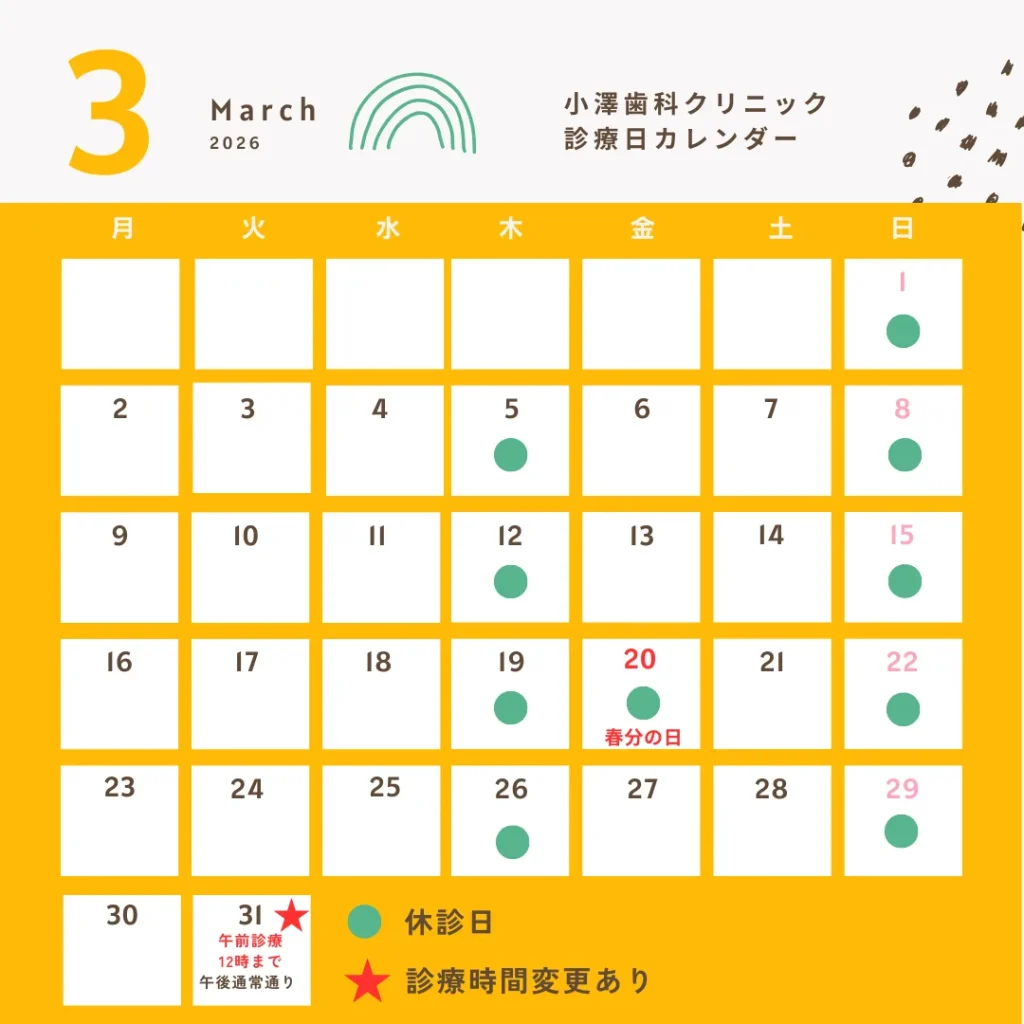 3月の診療日カレンダー2026.02.26こんにちは。静岡市駿河区の歯医者、おざわ歯科クリニック(旧小澤歯科クリニック)です。3月の診療日カレンダーは上の画像の通りとなります。よろしくお願いいたします。 移転しました。前の記事